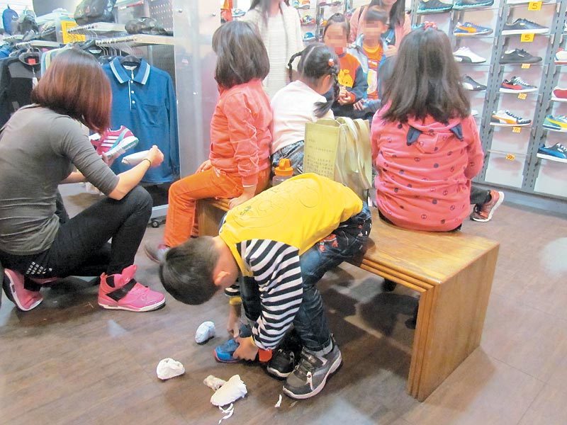 走出麥當勞,陳姓領班等人帶學童去鞋店挑選運動鞋;「我要免鞋帶的」、「我要紅色的」,店員幫忙挑選合適的鞋子。一名學童挑選一雙名牌的氣墊鞋,店員看了面有難色,輕聲告訴陳姓領班,「怎麼辦,這一雙要三千多元」。
