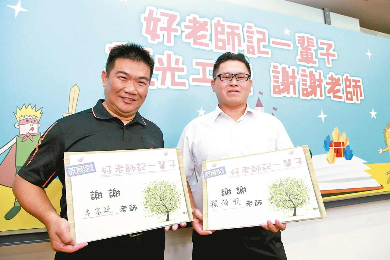 教育部舉辦「好老師記一輩子」的活動,特別邀請高雄市甲仙國小張永豪(左)到場,寫下自己心中感謝的老師名字。 記者程宜華/攝影