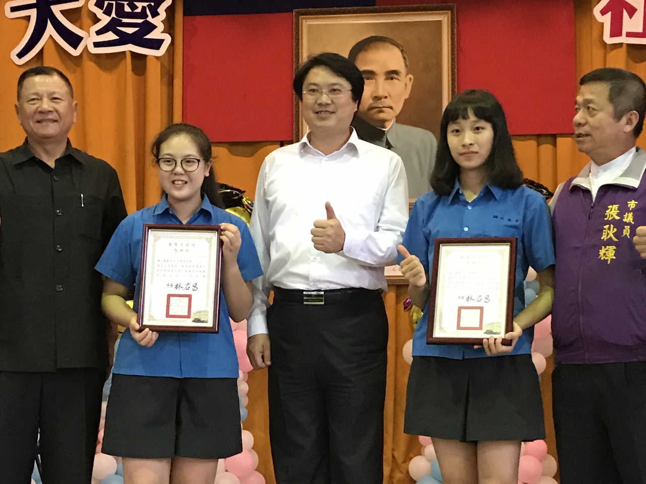 國立基隆高中王紫瑄(左二)、葉律彤兩人,在下雨的夜裡,協助聯結車司機脫困,今天接受市長林右昌表揚。記者吳淑君/攝影 |