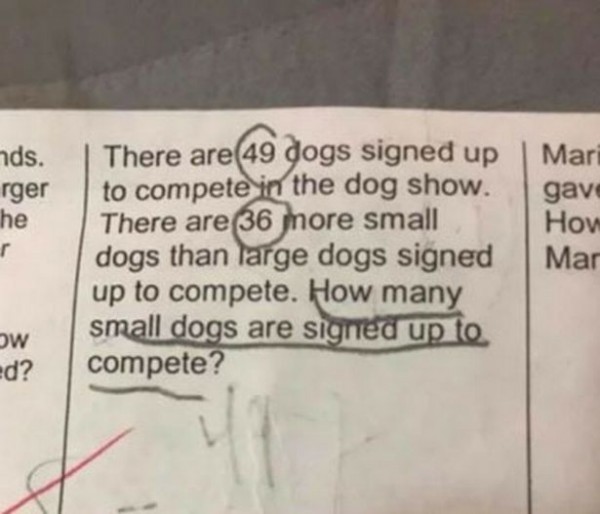 綜合外媒報導,英國媽媽安琪(Angie Werner)最近在一個臉書上的媽媽社團貼出小學二年級女兒的數題目,希望其他媽媽能幫忙解答。題目說明如下:「狗狗展總共找來49隻狗狗參加,其中小狗的數量比大狗多出36隻,請問狗狗展裡總共有幾隻小狗?」由於這道小二題目需要用到代數,讓許多媽媽都答不出來只能放棄。