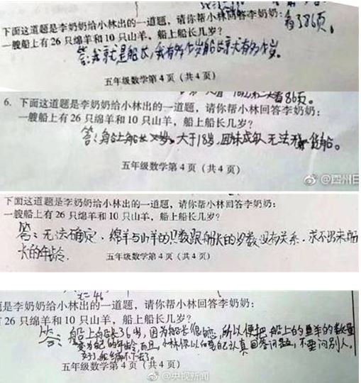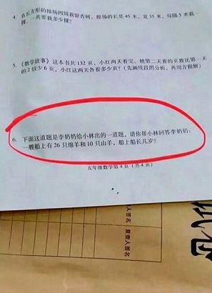 這道小學數學題你解的出來嗎?中國四川省一間小學期末考出了這樣一道題目,「這道題是李奶奶給小林出的一道題,請你幫小林回答奶奶:一艘船上有26只綿羊和10只山羊,船上船長幾歲?」,難倒不少學生,還有學生崩潰表示自己「編不下去了...」。
