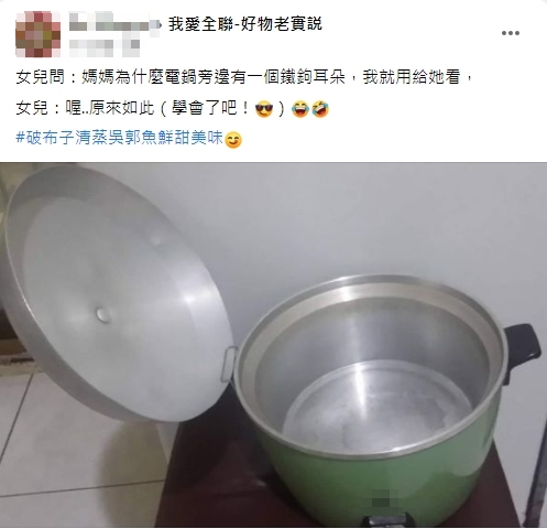 一名家庭主婦在臉書社團《我愛全聯-好物老實説》表示,日前女兒突然問自己:「媽媽為什麼電鍋旁邊有一個鐵鉤耳朵?」於是原PO馬上示範給女兒看,原來這個鐵鉤是掛鍋蓋使用的,將鍋蓋傾斜45度角,就能傾斜地卡在鐵鉤與把手之間的縫隙,不需再將熱到燙手的鍋蓋另外找地方放置,用途相當便利!