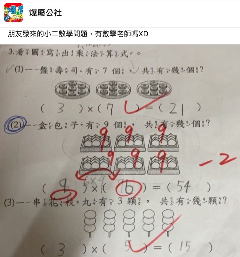該名網友在臉書社團《爆廢公社》發文並貼出一張圖片,表示朋友傳來一道小學二年級的數學題目,希望有數學老師可以出面幫忙解惑一下;而題目內容則是「一盒包子有9個,共有幾個」,而圖片上則是有6盒包子。學生原本的算式寫「6X9=54」,但卻被老師扣了兩分,才訂正改為「9X6=54」。