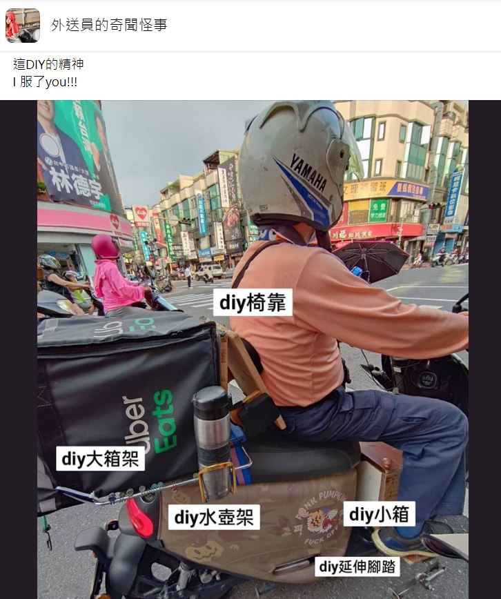 隨著外送平台崛起,民眾現在不用出門只要用手機下訂,就可以享用到熱騰騰的美食。日前有一名外送員在外送途中看到前方同行「前輩」,機車上各個裝備包含水壺架、椅靠及外送箱價都是自己DIY,讓他相當佩服,眾人見狀也豎起大拇指狂讚,「超狂,這是土砲吧」。