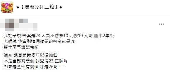該篇分享一出,立刻引發網友們熱烈討論和回應;不少人認同原PO和其姪子想法,認為正確答案應該是23個才對;也有網友點出,「我當下直覺也是算26個,應該要說總共有幾個10元,換23個確實也沒錯,這題目很有問題」,也有人不客氣地問,這是在考數學還是考國文?有網友則表示,「兩種答案都算對,答23表示真的有了解題目,答26則是小孩比較直覺的回答」。