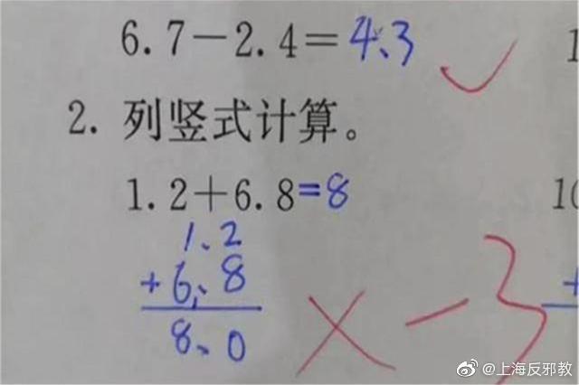 這名網友在微博分享,近期檢查國小兒子的數學考卷,發現一道數學題,兒子明明寫對,卻被老師打叉並扣了3分,該題數學題目為「1.2+6.8」,並要求列出直式計算,兒子算完後,在答案處寫下「8」,不解到底錯在哪?