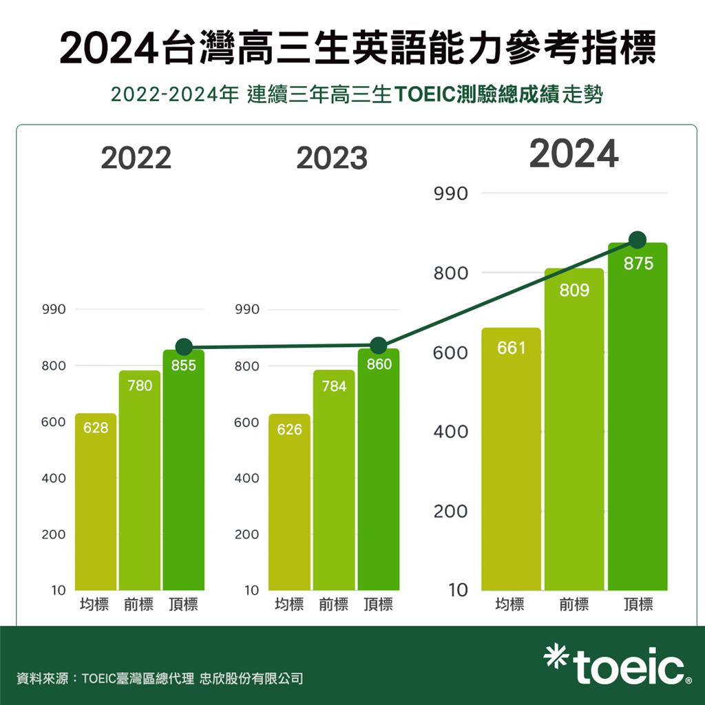 根據忠欣公司統計,2022年到2024年,台灣高三學生多益成績的均標是628分、626分、661分;前標是780分、784分、809分;頂標是855分、860分、875分。其中,2024年的頂標及前標均創下歷史新高。