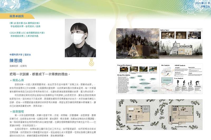 首次榮獲「技職之光」殊榮的陳恩綺表示,能獲得教育部的肯定是莫大的鼓勵。她回憶設計歷程時特別感謝中國科大建築系提供的學習資源,以及紀昊昀老師在設計發展與國際競賽策略上的耐心引導。從大一的迷惘到站上國際舞台,感謝紀昊昀老師沒有放棄我。這座獎項證明了只要願意堅持、嚴格要求自己,就能在建築的路上發光發熱。
