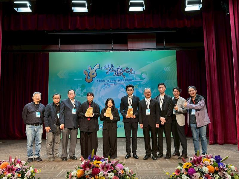 第21屆「技職之光」頒獎典禮中國科大獲獎師生合影。(左4為獲獎學生陳恩綺,右3為指導教授紀昊昀)(照片/校方提供)