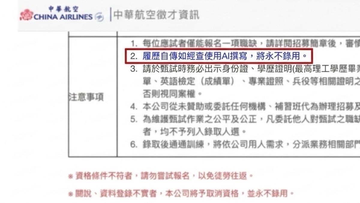 華航官方網站徵才頁面中,無論是修護人員或機電副工程師職缺,在注意事項欄位皆以藍色字樣標註,履歷自傳如經查使用AI撰寫將永不錄用。華航回應表示,為維護公平,期待應試人員如實撰寫自身經歷,以評估是否符合職務需求,相關標準與作法以公司內部整體流程為準。