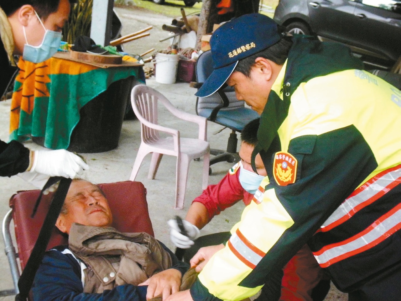 陳天清進屋後,赫然發現原來是老所長報案,趕緊上前替已清醒的老所長按摩壓驚,舒緩情緒,隨即指引救難人員將老所長送醫。 |