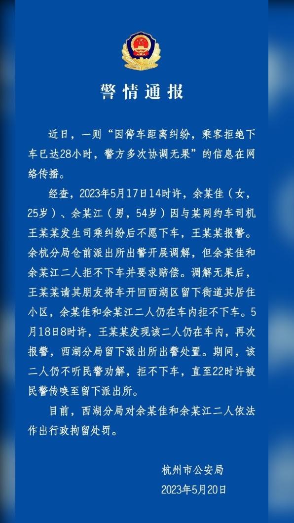 報導中還提到,事實上當地警方有接獲兩次通報,不過此案屬於民眾之間個人糾紛,警方能做的只有盡量協調。因王女工作受影響,父女倆始終不肯下車,余女甚至在車上直接尿尿,留下濃濃尿騷味。為儘快解決問題,王女最後把車子開到派出所門口,父女倆終於在18日晚間10時許被逮捕,雙雙拘役7天,並須賠償王女人民幣1500元(約台幣6548元)。