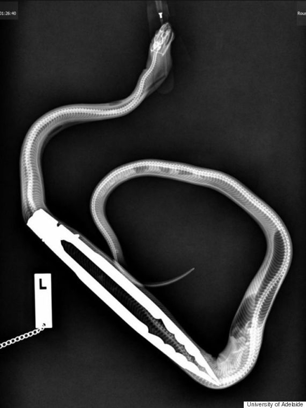 針對這條蟒蛇的狀況,獸醫在聽完Aaron Rouse所描述的事發經過後,最初以為蟒蛇吞下的只是小鉗子之類的物品,但經X光掃描後,卻發現是個大型烤肉夾,表示從照片中可清晰看見烤肉夾的形狀與夾子稍微把蛇的肚子撐大。