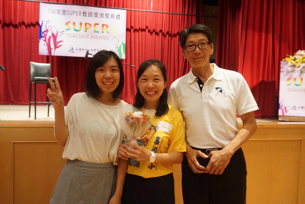 金門縣金湖國小附設幼兒園老師王慧騏(中)勇奪全國SUPER教師獎,夫婿陳延進(右)、女兒蔡欣燁(左)在頒獎前她加油打氣,得知她獲獎後,與她分享喜悅。中央社