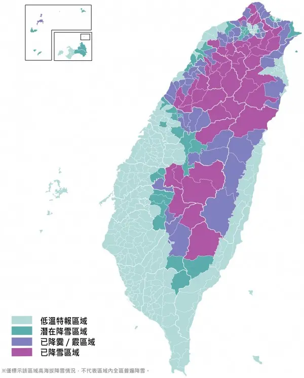 事實上2016年的霸王級寒流來襲時,在PTT大氣科學板就有鄉民匯集出全台降雪圖,當時包含台北市、新北市、桃園市、新竹縣、苗栗縣、宜蘭縣、台中市、南投縣、嘉義縣、雲林縣、台東縣等縣市都出現降雪現象。
