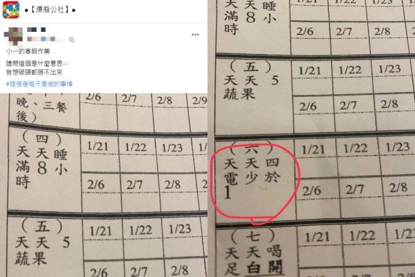 該名男網友在臉書社團《爆廢公社》分享一張孩子的寒假作業,表示這張是小一孩子天天都要完成的事項列表,而且要按照日期替孩子打勾確認有執行,項目包含「天天睡滿8小時」、「天天5蔬果」,但是其中有一項寫著「天天四電少於1」,讓他想破頭都掰不出來這是什麼意思?