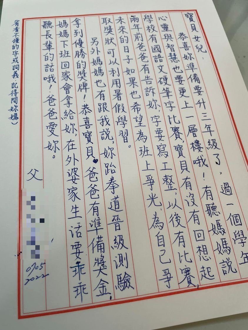 每個人的筆跡都是獨一無二,正所謂「字如其人」,往往也反映出真實性格與心理狀態。有名網友的女兒要升小學三年級,為了鼓勵孩子積極向上,特地手寫一封家書,展現父愛。只是眾多網友看到後瞬間歪樓,因為字跡太過工整,還使用傳統的信紙,忍不住開玩笑地說:「坐過牢?」