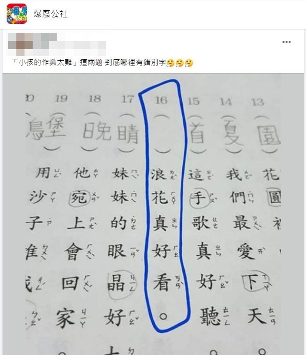 原PO在臉書社團「爆廢公社」發文,並分享一道國小國語題目,要在「浪花真好看」5字裡面找出錯字。不過,孩子怎麼找都不出來而向他求助,自己看了題目好幾遍,他也看不出那裡有問題,完全被考倒了,讓他忍不住崩潰直呼,「到底哪裡有錯別字?」