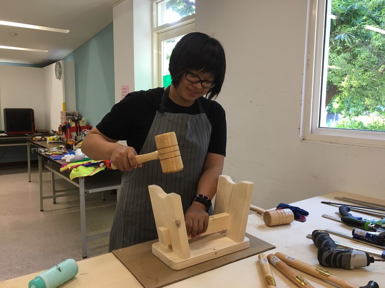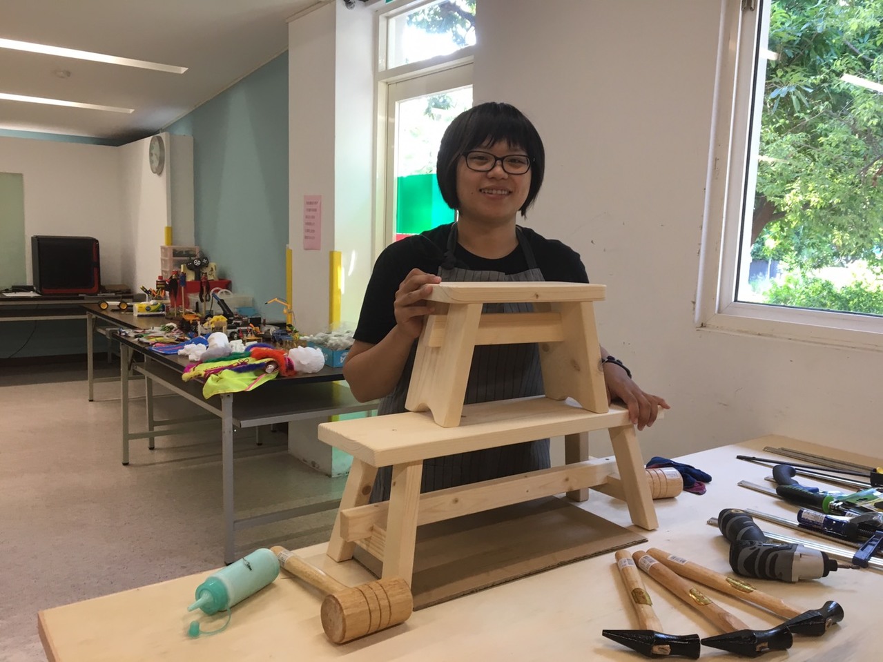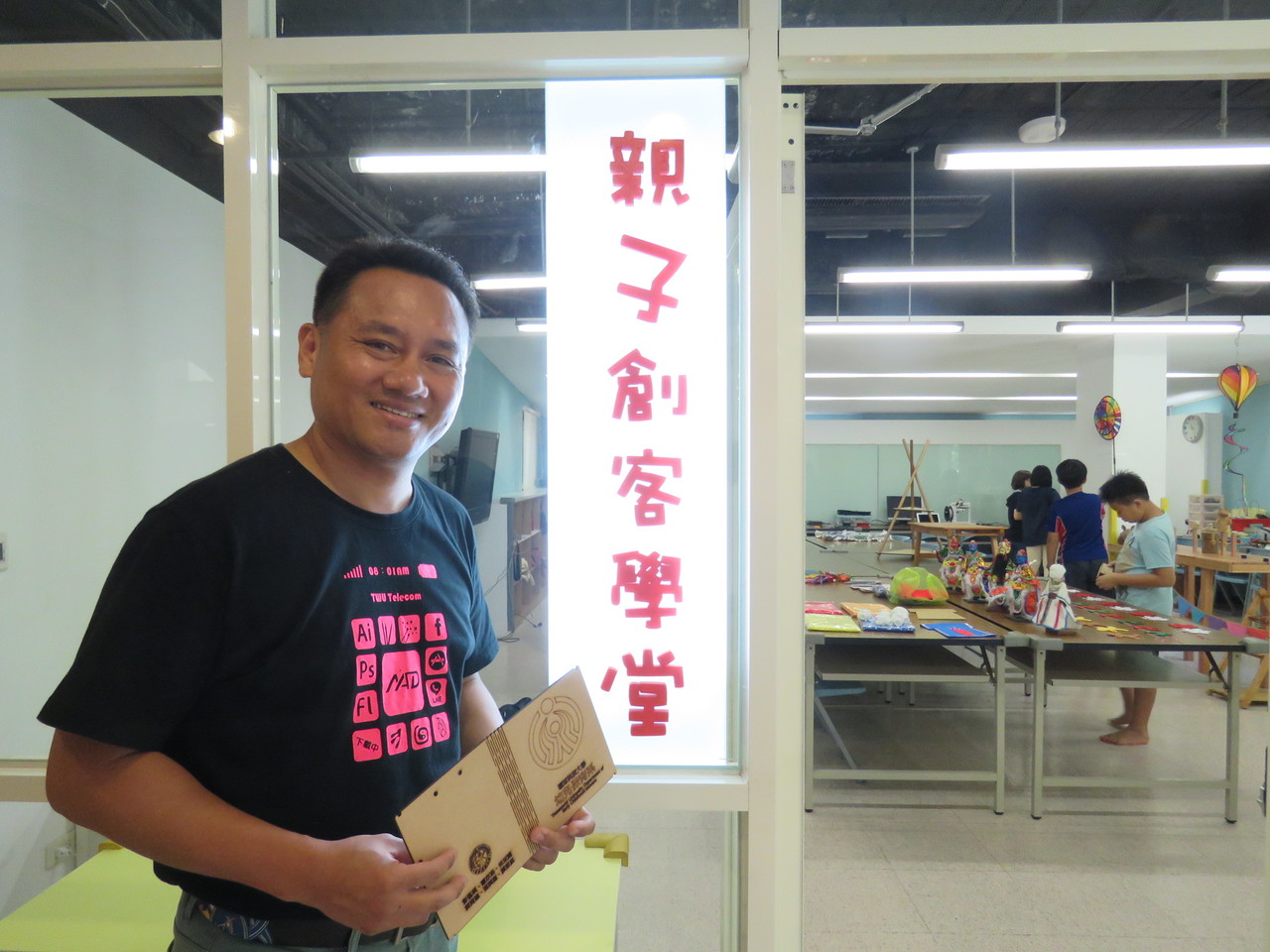 環球科技大學教授郭良印在雲林打造充滿童趣的木工天堂創立親子創客學堂,為自己實踐夢想,不分男女讓學生熟稔地拿著小木槌,專心一致地一刀一畫、一敲一鋸,為製作心目中好的椅子及玩具,讓學生自在快樂當個木工創客,體會惜物環保。
