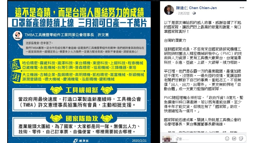 副總統陳建仁曾在臉書曝光這些幕後英雄名單,指出這群產業龍頭為了疫情,放下自己事業當起志工,自主國家隊,感謝「了不起的國家隊,讓我們致上最高的敬意和謝意,有口罩國家隊真好。」工具機公會理事長許文憲當時表示,TMBA團隊一定合作完成任務不會退縮,強調與政府站在一起穩定民心,需要多少人力,鼎力配合到底。