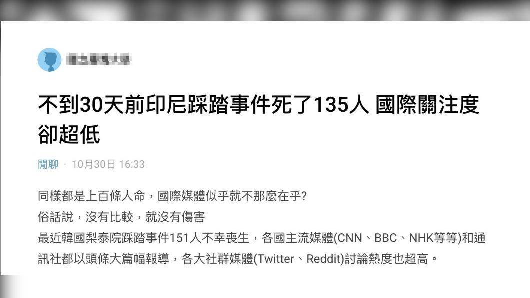 梨泰院事件發生後,一名網友就在Dcard上詢問,為什麼不到一個月前的「印尼踩踏事件」國際關注度沒那麼高?而且明明在台灣的印尼人比韓國人還要多,身邊的人似乎卻只關心韓國的事故,讓原PO相當疑惑。