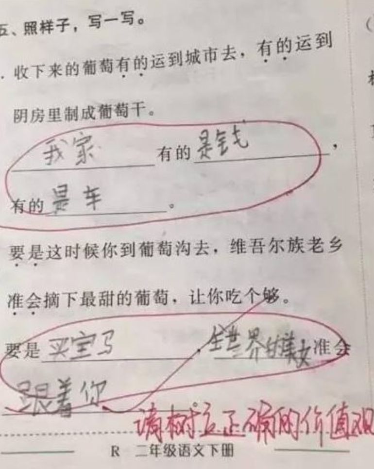 而這位小學生在第一道題目寫下「我家有的是錢,有的是車」,第二道題更直接寫下「要是買寶馬(BMW),全世界的美女準會跟著你」;雖然以題目語意是沒錯的,但以小學生來說已是非常超齡且語出驚人的程度,也讓老師驚呆,並在一旁寫下「請樹立正確的價值觀」。