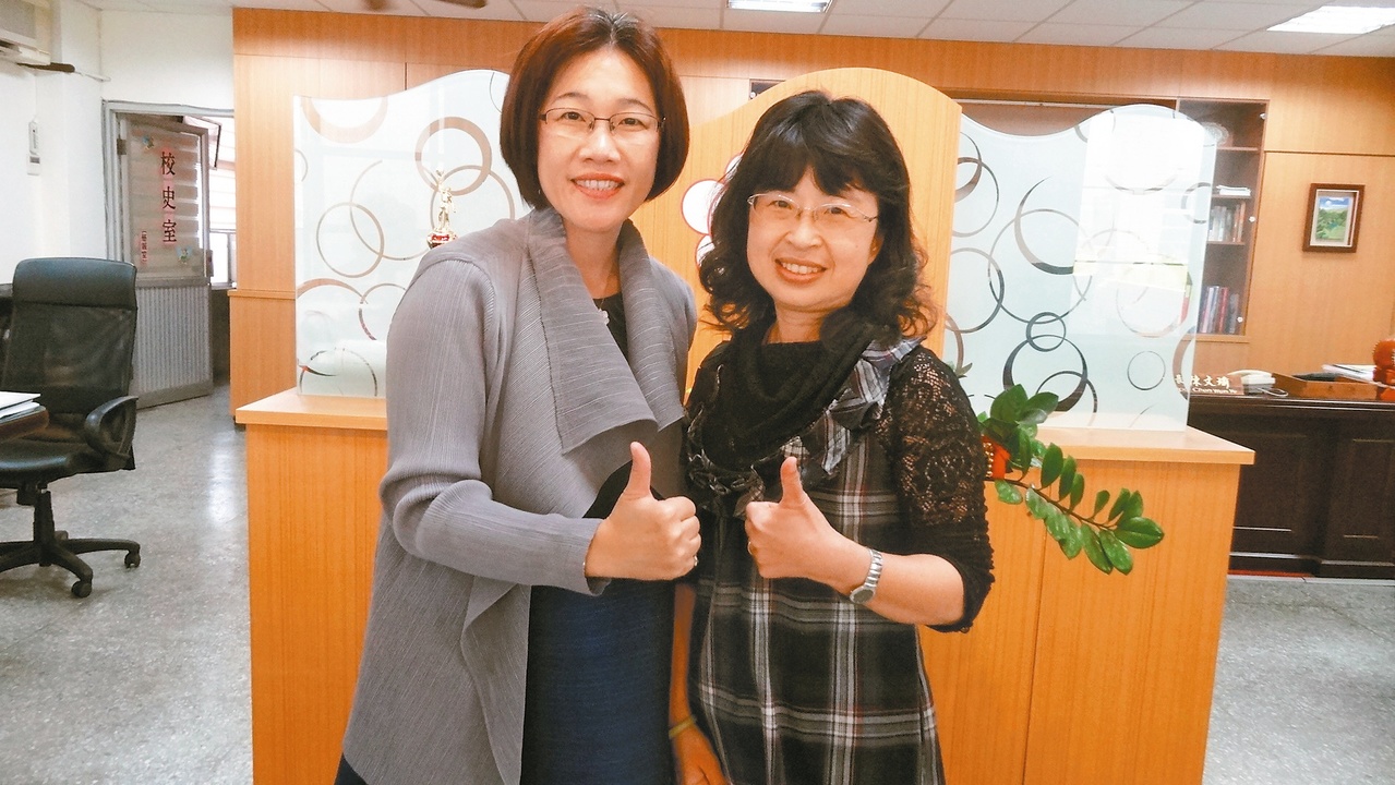楊文菁(右)榮獲星雲教育獎的「典範教師獎」,校長陳文瑜讚揚她是興安及嘉義之光。 記者魯永明/攝影