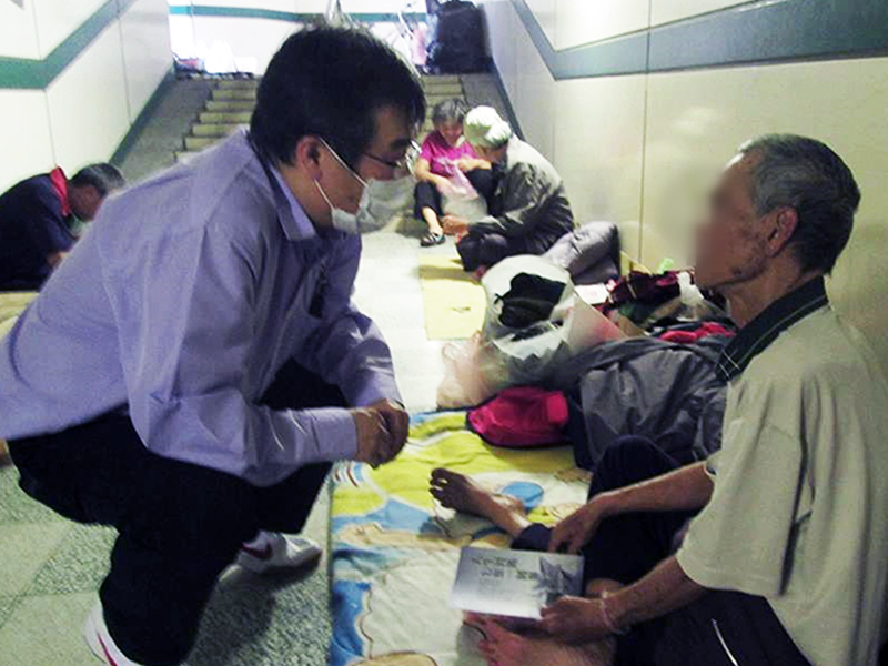 劉奇峯重新站起,每天向年邁的街友寒暄問暖、禱告。